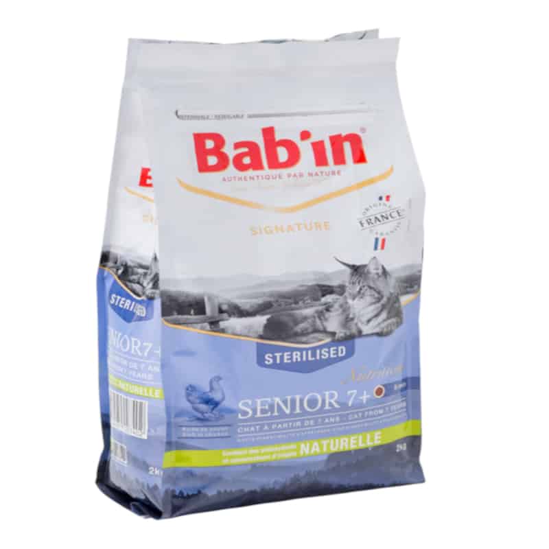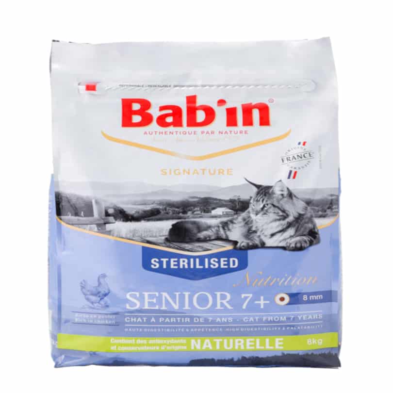 Les croquettes pour vieux chat BAB’IN SENIOR sont riches en poulet et en minéraux, pour répondre aux besoins spécifiques des chats séniors et aux troubles physiologiques liés à leur âge. Hautement digestibles, elles participent au soutien articulaire et favorisent un pelage brillant et une peau saine. Elles sont fabriquées en France dans le Sud-Ouest.