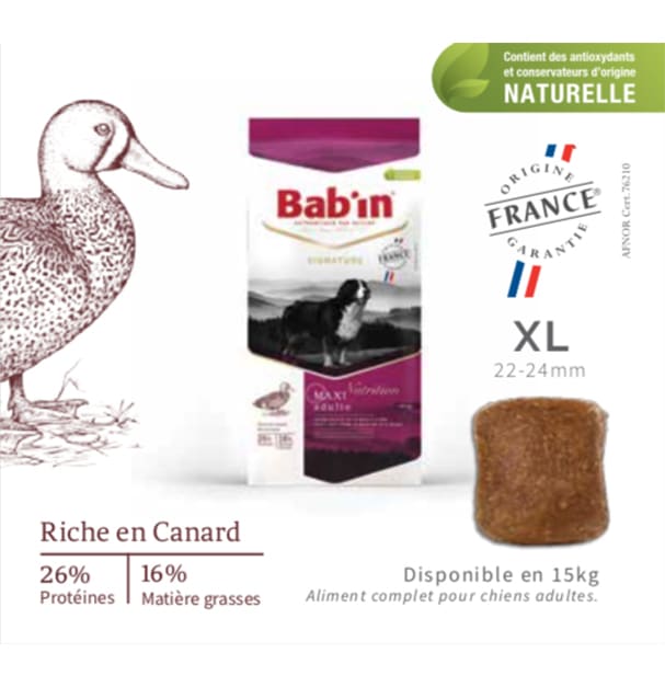 Les croquettes Bab’in MAXI ADULT pour grand chien sont formulées spécifiquement pour les animaux dont le poids de forme est supérieur à 25kg. Cette recette contient 27% de protéines animales (dont 81% de canard), apportant ainsi les protéines nécessaires au métabolisme des chiens de grandes tailles. Le calibre XL de 22 à 24 mm des croquettes BAB’IN MAXI ADULTE invite votre chien à bien croquer, lui assurant ainsi une bonne digestion ainsi qu’un bon nettoyage des dents. Il limite ainsi les risques de retournement de l’estomac bien connu chez nos compagnons de grande race.