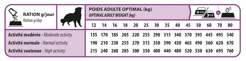 Distribuez à sec en laissant de l’eau fraîche à disposition. Les rations journalières sont à titre indicatif et doivent être adaptées aux besoins de votre chien. Si vous changez d’aliment, effectuez une transition progressive (7 jours). Conservez dans un endroit frais, sec à l’abri du soleil et refermez le sac après utilisation. Utilisez de préférence avant la date limite indiquée, N° de lot & d’agrément (voir emballage).