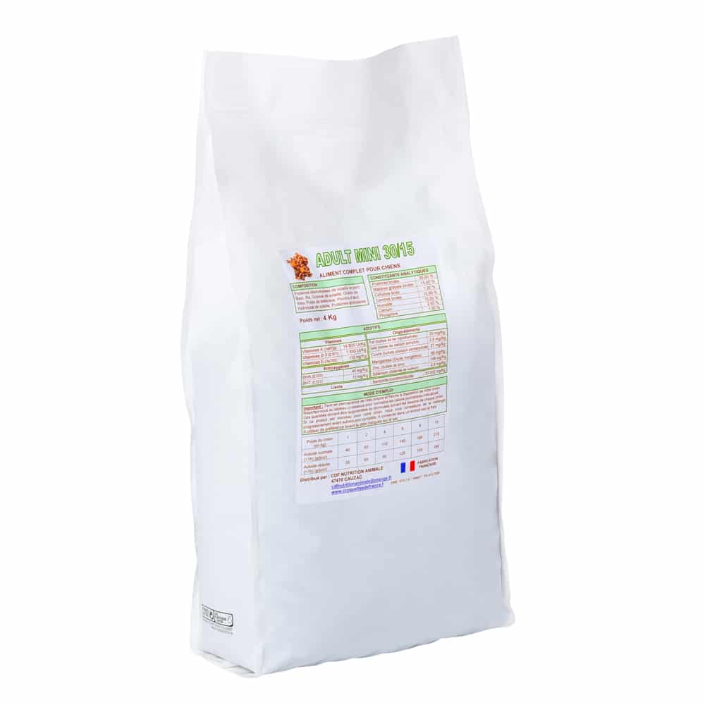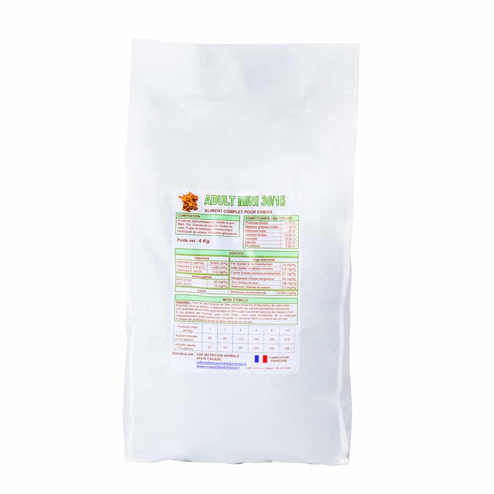 Les croquettes française pour chien de petite taille ADULTE MINI 30/15 sont riches en viande, elles sont formulées à partir de protéines animales déshydratées dont 24% de volaille.