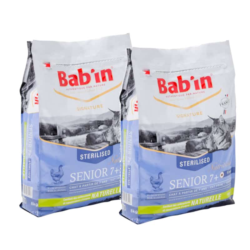 Les croquettes BAB’IN CHAT SENIOR 7+ favorisent la bonne santé du système rénal grâce à un apport minéral et un pH contrôlé. Elles contribuent au bon fonctionnement articulaire (glucosamine, chondroïtine) et leur apportent un pelage brillant et une peau saine.