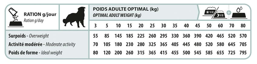 Distribuez à sec en laissant de l’eau fraîche à disposition. Les rations journalières sont à titre indicatif et doivent être adaptées aux besoins de votre chien. Si vous changez d’aliment, effectuez une transition progressive (7 jours). Conservez dans un endroit frais, sec à l’abri du soleil et refermez le sac après utilisation. Utilisez de préférence avant la date limite indiquée, N° de lot & d’agrément (voir emballage).