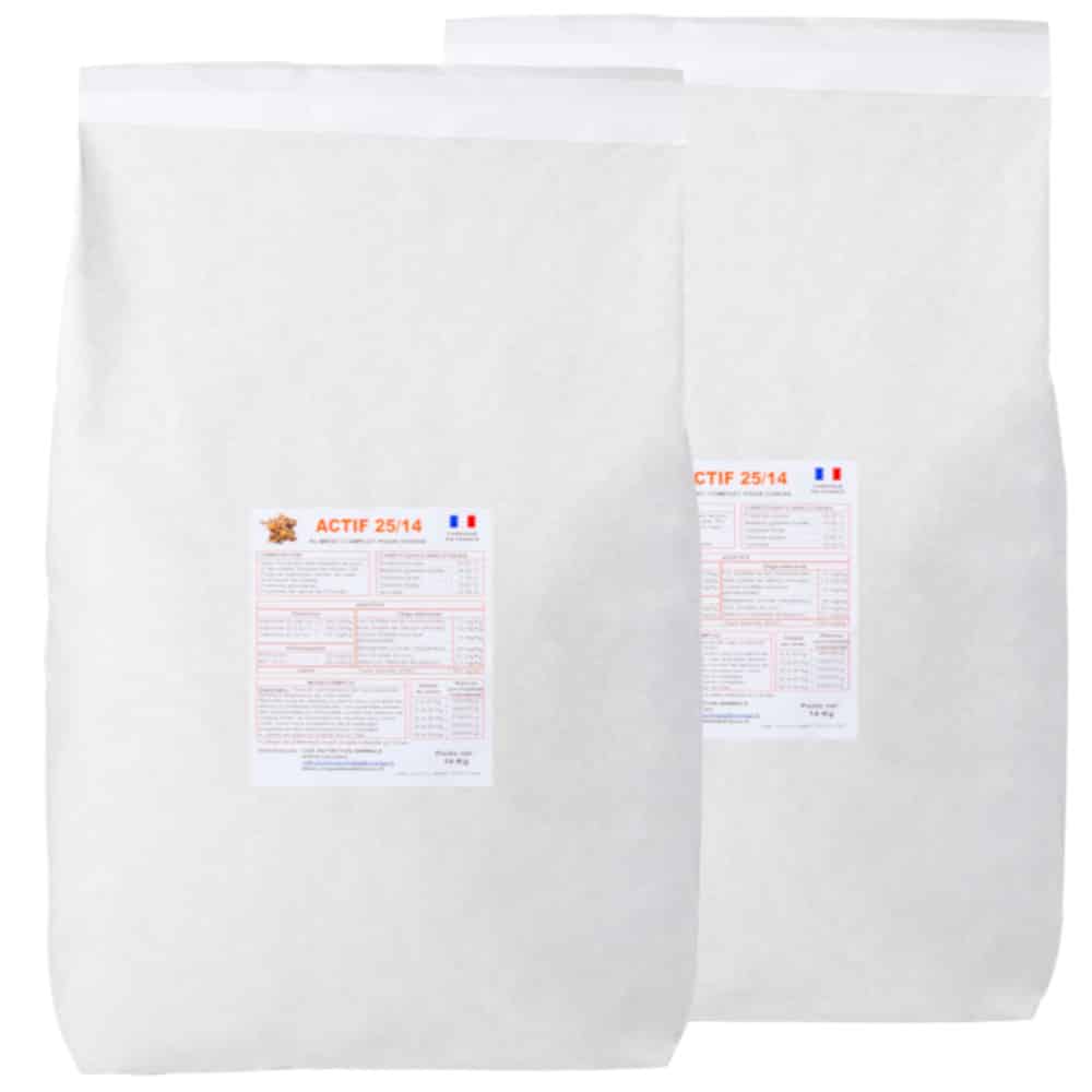 Présentées en paquet de 14 kg, les croquettes ACTIF 25/14 (25% de protéines et 14% de matières grasses) pour chiens adultes de plus de 5 kg, sont fabriquées en FRANCE pour vous garantir un maximum de rigueur lors de leur fabrication.
