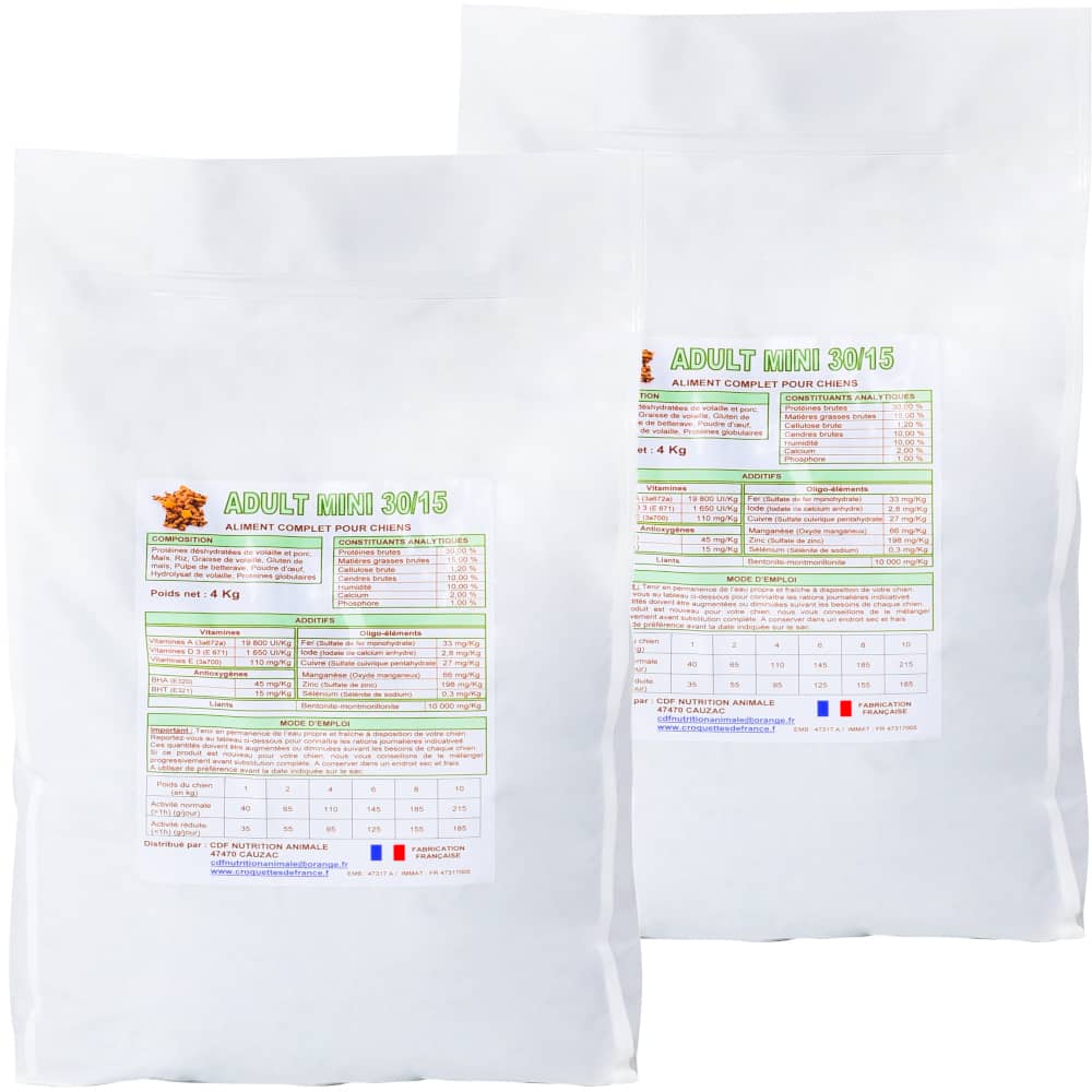 Les croquettes française pour chien de petite taille ADULTE MINI 30/15 sont riches en viande, elles sont formulées à partir de protéines animales déshydratées dont 24% de volaille.
